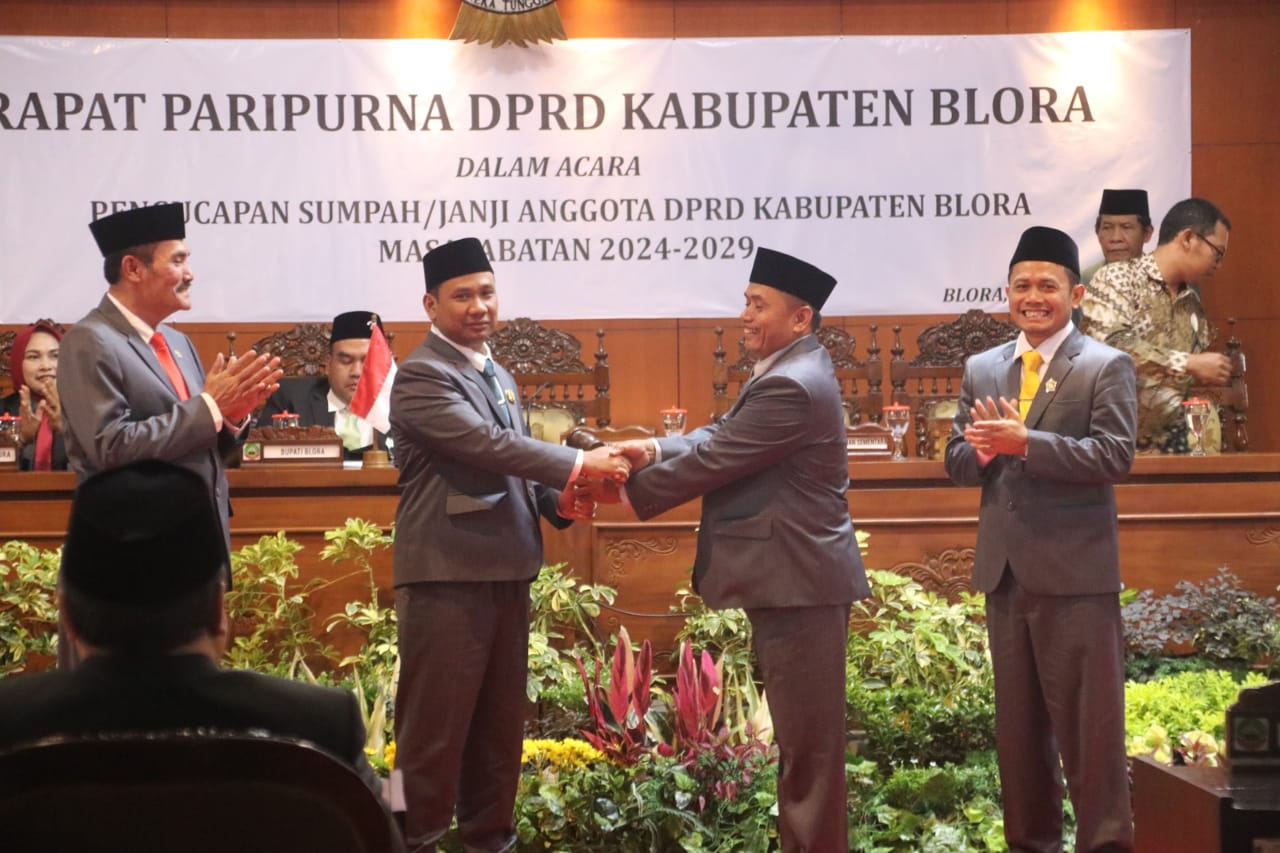 “Oleh karena itu, berdasar jadwal yang ditetapkan oleh Badan Musyawarah DPRD, hari ini diselenggarakan rapat paripurna dengan acara Pengucapan Sumpah/Janji Anggota DPRD Kabupaten Blora Masa Jabatan Tahun 2024-2029,” terangnya.